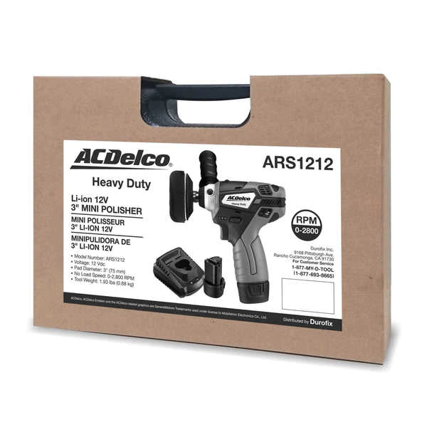 ACDelco G12 Compact 12V Li-ion Mini 3-inch Polisher / Sander, 2 Batteries Kit, ARS1212 G12 Compact Series Tools are designed with power & compact size in mind. The family includes a wide range of tools, from drill driver to ratchet wrench and polisher, all share a common slim 12V Li-ion battery platform FEATURES * Compact and light weight Design (5.5" long, 1.93 lbs) * Convenient two positioned side handle * Up to 2,800 RPM with variable speed with reversible control and electric brake switch * Built-in battery indicator * Compact & Ergonomic Soft Grip Design with rubber boots Includes: 2x Battery Pack, 1x Charger, 3" pad x2 & accessories SPECIFICATIONS * Voltage: 12V DC * Drive: 3" backing pad * Pad Thread size: M6-10 (1/4"-20 or 1/4"-28) * Length: 5.5" * No Load Speed: 0-2,800 RPM * LED light: Yes * Battery indicator: Yes * Tool Weight: 1.93 lbs (0.88 kg) * Battery: AB1207LA Li-ion 2Ah (charger: ADC12US07-99)
