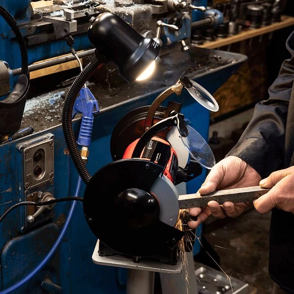 With a powerful 1/2 HP motor, the tool features a 120V, 2.8 Amp. 60 Hz. ball bearing motor. Additionally, a large flexible work light (bulb not included) and adjustable steel work rest help with high-speed material removal. Made from durable die cast aluminum and to help conduct operations with optimum efficiency, the motor includes (1) standard safety glass, (1) magnifying safety glass, and (1) water tray. Ideal for most heavy duty industrial applications, the bench grinder is easy to use and sturdy enough for effective and productive results. Established in 1963, American Forge & Foundry (AFF) has provided value through our selection of highest-quality, "forge tough" heavy-duty and automotive service equipment. From our extensive inventory of parts to the hundreds of service depots available nationwide our experienced team is committed to ensuring that the AFF brand stands for durability, safety, and customer care.