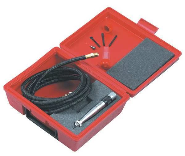 - Includes: 1 Carry Case, 2 Air Filter Assembly, 3 Stylus – Carbide Tipped, Writing and Engraving, 3/16 in Bore, 4 Anvils, 5 Flat Chisels, 6 Chisel Blanks, 7 Round Nose Chisel, Air Hose