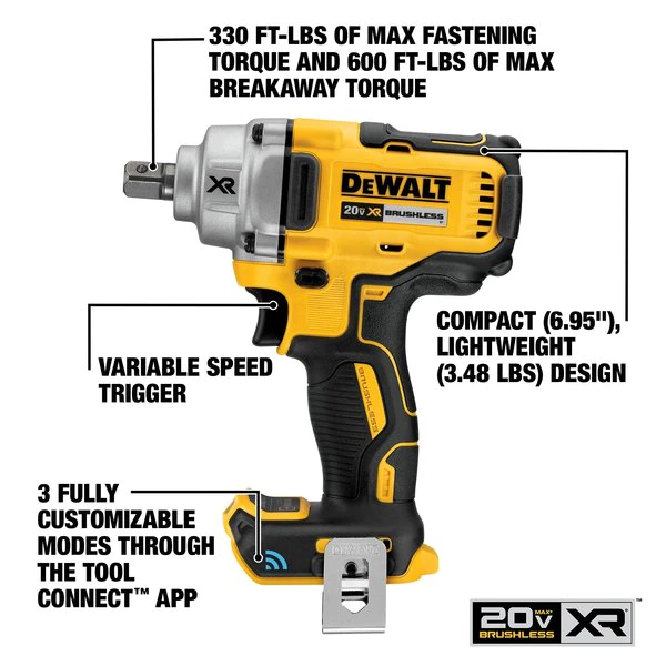 Cordless Impact Wrench Kits, Impact Wrench, Drive Size 1/2 in Square, Drive Configuration Straight, Max. Torque 330 ft-lb, Battery Included, Voltage 20V DC, Series 20V MAX, Cordless Tool Battery Type Li-Ion, Brushless Motor Yes, Anvil Impact Action Mechanical, Max. Blows per Minute 3100, Max. No Load RPM 2000, Cordless, Handle Type Pistol Grip, Battery Capacity (2) 5.0Ah, Tool Length 6-61/64 In., Tool Weight 3.5 lb, Clutch Style Detent Pin Anvil, Battery Included 31AC52. The DCF896 Mid-Range Impact Wrench is based off of the latest edition to the DEWALT® impact wrench family, the DCF894. Integrated Bluetooth® technology pairs this tool with the free Tool ConnectTM mobile app and online inventory manager portal, allowing users to track, manage and customize the tool settings. Through the app, users are able to program three customized modes based on individual needs and have control over forward and reverse speed to account for different fastener sizes and types, LED brightness and delay as well as Precision WrenchTM and the all new exclusive Precision TapTM modes. Within Precision WrenchTM, users can program the tool to automatically shut off after impacting for a set amount of time, useful for those performing repeatable applications and helps with tightening consistancy by removing variability in impact time. Precision TapTM mode is designed to make tapping threads faster and easier by having the tool automatically alternate between forward and reverse, keeping rotations consistant and eliminating the need to manually change the tool's direction. Use this tool along with other Tool ConnectTM offerings for a complete management solution.