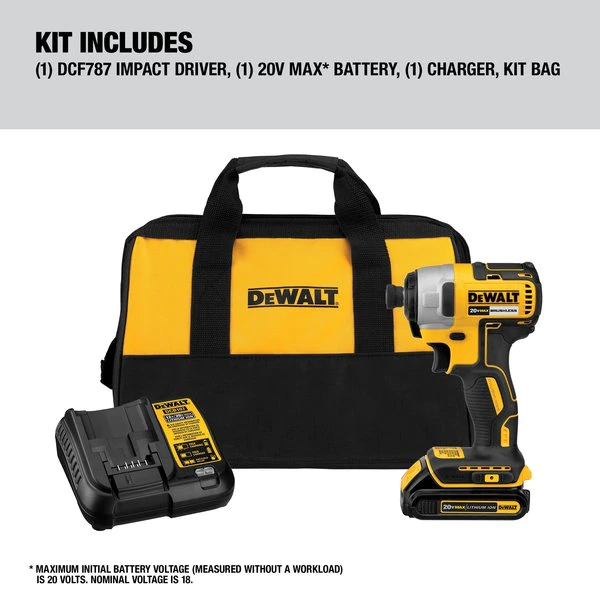 Impact Driver, Drive Size 1/4 in Hex, Drive Configuration Straight, Max. Torque 1,500 in-lb, Voltage 20V DC, Brushless Motor Yes, Free Speed 2,800 RPM, Number of Speed Settings 1, Collett 1/4 in Hex, Cordless Tool Kit Contents (1) Bare Tool, (1) Battery, (1) Charger, Number of Batteries Included 1, Battery Capacity (1) 1.3 Ah, Battery Model No. Mfr. No. DCB201, Battery Series 20V Max, Charger Included Yes, Charger Model Mfr. No. DCB107, Case Included Yes, Handle Type Pistol Grip. DCF787C1 Brushless cordless impact driver is powered by a 20V MAX* battery (1.3 Ah battery included). The Impact Driver's compact and lightweight design allows the tool to be utilized in tight areas while the 3 LED lights provide visibility in low lit areas.