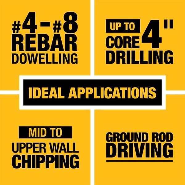Cordless Rotary Hammer Kit, Voltage 60V DC, Chuck Style SDS-Max, Solid Bit Optimal Drilling Range in Concrete 5/8 in to 1 1/4 in, Core Bit Capacity in Concrete 1 3/4 in, Blows per Minute 1,450 to 2,900 bpm, Anti-Kickback Clutch Yes, Modes of Operation Hammer and Rotate, Brushless Motor Yes, Cordless Tool Kit Contents (1) Bare Tool, (1) Charger, (2) Batteries, Battery Capacity 9.0 Ah, Core Bit Capacity 4 in, Impact Energy 7.7 ft-lb, Battery Model Number DCB609, Battery Series Flexvolt