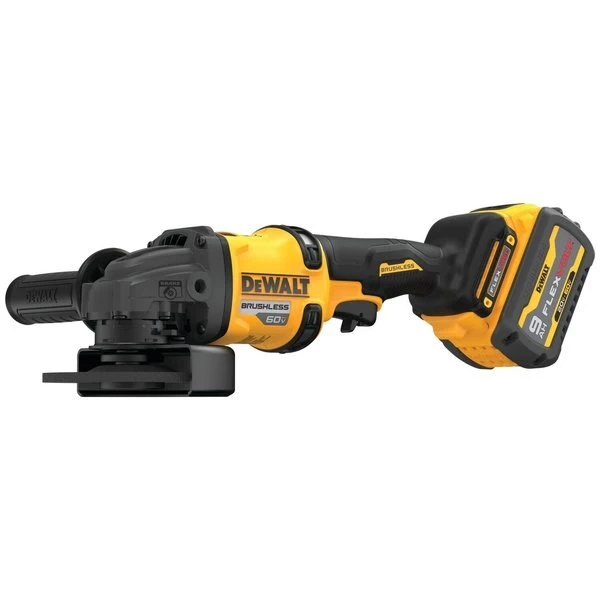 Angle Grinder Kit, Head Type Standard Head, Grip Style Rat Tail, Voltage 60V DC, Wheel Diameter 4 1/2 in, 6 in, For Wheel Type Type 27, Brushless Motor Yes, Battery Capacity (1) 9.0 Ah, Cordless Tool Kit Contents (1) Bare Tool, (1) Battery, (1) Charger, Safety Features Anti-Kickback Clutch, Anti-Restart, Brake, Lock-Off Switch, Switch Type Trigger, Lock-Off Switch Yes, Lock-On Switch No, Brake Type Electronic, Max. Speed 9,000 RPM, Minimum Speed 9,000 RPM, Spindle Thread Size 5/8 in-11
