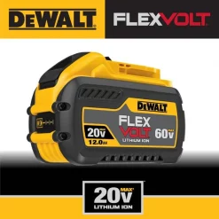 Battery, Battery Capacity 12 Ah, Battery Chemistry Li-Ion, Charger Included No, Number of Batteries Included 1, Voltage 20V DC/60V DC, Cordless Tool Kit Contents (1) Battery, Charger Input Voltage 120V AC, Battery Series FLEXVOLT, Cordless Tool Battery Platform 20V/60V FLEXVOLT, Overall Height 3 3/4 in, Overall Length 5 3/8 in, Weight 3.2 lb, Wireless Tool Tracking No. The FLEXVOLT® 20V/60V MAX* 12.0 Ah battery provides up to 8X runtime** (**With DCB612 FLEXVOLT® battery when used with DEWALT 20V MAX* tools compared to DCB201 1.5 Ah battery pack.) in 20V MAX* and delivers ultimate power in 60V MAX* and 120V MAX* cordless tools*. It changes voltage when you go from 20V MAX* to 60V MAX* tools. Lithium Ion technology delivers performance in the same size as our 9.0 Ah battery, so it is more powerful in as compact a package as possible. It also includes a built-in LED Fuel Gauge for instant charge status, and is compatible with 20V MAX* tools and chargers.