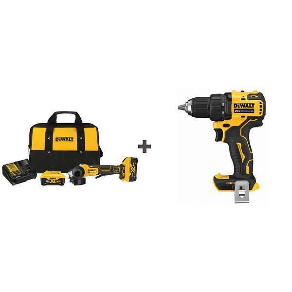 Cordless Combination Kit, Cordless Tools Included Angle Grinder, Drill, Voltage 20V DC, Power Source Cordless, Number of Tools 2, Battery Capacity 6.0 Ah, Includes Hex Key Wrench, Inner/Outer Flange, Side Handle, Tool Brand DEWALT(R), Series 20V MAX XR, Battery Included (2)52NA71, 52NA72, Number of Batteries Included 2, Battery Model No. Mfr. No. DCB206, Battery Series 20V MAX XR, Charger 11A157, Charger Included Yes, Cordless Tool Kit Contents (2) Bare Tools, (2) Batteries, Charger