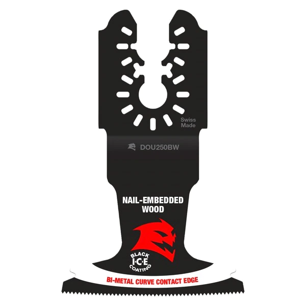 Diablo’s universal fit bi-metal oscillating blades feature application specific designs that deliver maximum durability and longer life in nail-embedded wood applications. These high-performance blades feature an ultra-hardened cutting edge to deliver up to 5X longer life than standard blades. Curve contact edge creates a pilot for precise, clean plunge cuts with less vibration. Black I.C.E. (Industrial Cooling Element) keeps the teeth cool and build up free for fast, clean cuts. The blade’s universal fit, adapter-free design easily attaches most tools, with the exception of Starlock tools.