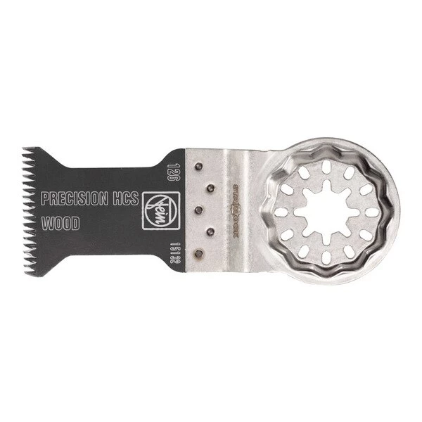 The FEIN Starlock Precision E-Cut 126 saw blade maximizes performance for the most efficient work progress possible. With the double-row Japanese tooth design the Precision E-Cut 126 saw blade gives the fastest work progress and maximum precision for all wood materials drywall and soft plastics. Featuring the Starlock mounting system the Precision E-Cut 126 saw blade fits every popular multifunction tool on the market. Even if you don’t own a FEIN oscillating multi-tool you can affordably upgrade output by choosing a FEIN Starlock blade. FEIN originated the oscillating tool and is proud to offer innovative and durable accessories that achieve ultimate performance