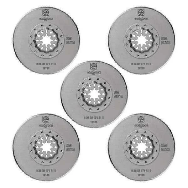 Oscillating Tool Blade, Blade Type Long Cut, Connection Style Starlock, Blade Shape Round, Blade Material Bi-Metal, Blade Diameter 3 3/8 in, Blade Width 3 3/8 in, Blade Length 13/16 in, Overall Length 3 3/8 in, Maximum Oscillations per Minute 19,500, Primary Material Application Soft Metals, Materials Cut Copper, GFRP, Plastic, Sheet Metal, Wood, Cutting Edge Style Toothed Edge, Edge Material Bi-Metal, Direct Fit For Tool Brand Bosch, Fein, Makita, Milwaukee, Ridgid, Number of Pieces 5