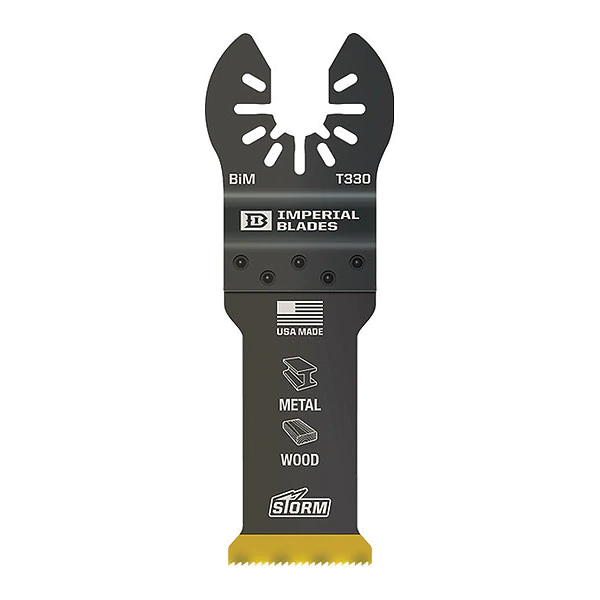 Imperial Blades' One FitTM 1-1/4" Multi-Material Storm Titanium Metal/Wood Blade is composed of heavy-duty bi-metal (BiM) and combined with Storm Titanium coating for the longest life and best performance. The wavy set tooth pattern makes this blade ideal for metal and multi-material applications by dispersing the wear on all teeth. Recommended applications include: Metal, Wood & Nails, Wood, PVC and more. Popular projects are deck maintenance, flooring and cutting framework containing nails or staples. One FitTM anchor fits majority of non-Starlock multi-tools: Milwaukee, Ridgid, Ryobi, Bosch, DeWalt, Dremel, Fein, Makita, Rockwell and more.