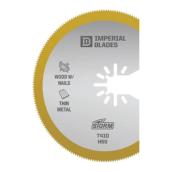 Imperial Blades' One FitTM 3-1/8" Storm Titanium Thin Metal Segment Blade is composed of high speed steel (HSS) and combined with Storm Titanium coating for the longest life and best performance. Segment blade shape is ideal for working in corners and on edges without over cut. Recommended applications are: Thin Metal, Wood, Fiberglass, PVC and more. Popular projects include long, straight cuts in sheet or thin metal for ductwork. One FitTM anchor fits majority of non-Starlock multi-tools: Milwaukee, Ridgid, Ryobi, Bosch, DeWalt, Dremel, Fein, Makita, Rockwell and more.