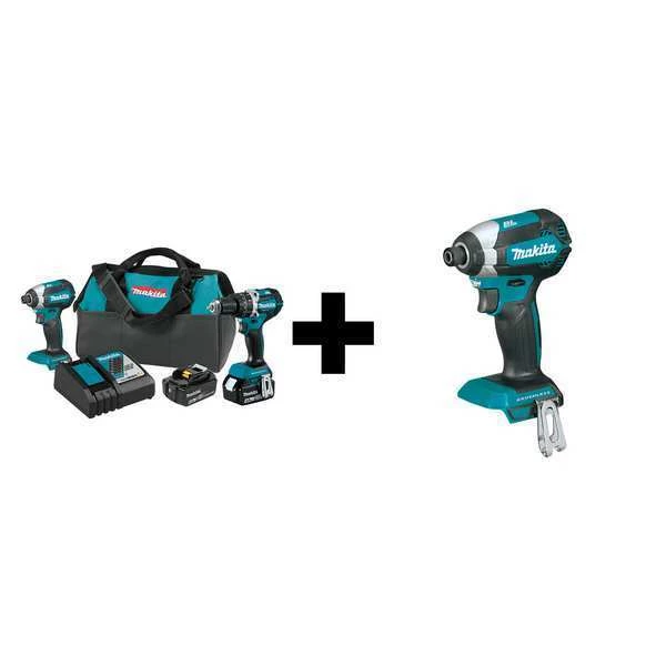 Cordless Tool Combination Kit, Cordless Tools Included Hammer Drill, Impact Driver, Impact Driver, Voltage 18.0, Power Source Cordless Electric, Number of Tools 3, Battery Capacity 1.5Ah, 2.0Ah, 3.0Ah, 4.0Ah, 5.0Ah, 6.0Ah, Includes (1) Tool Bag, Tool Brand Makita, Series LXT, Battery Included 33RT43, Number of Batteries Included 2, Battery Model No. (2) 33RT43, Battery Series LXT, Charger 4NNN4, Charger Included Yes, Cordless Tool Kit Contents (3) Bare Tools, (2) Batteries, (1) Charger