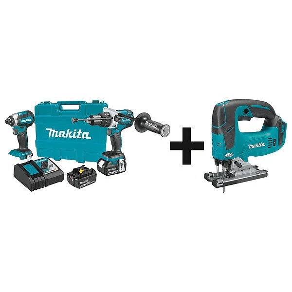Cordless Combination Kit, Cordless Tools Included Hammer Drill, Impact Driver, Jigsaw, Voltage 18V DC, Power Source Cordless, Number of Tools 3, Battery Capacity (2) 4.0 Ah, Includes Jig Saw Blade, Tool Brand Makita, Series 18V LXT, Battery Included (2) 33RT43, Mfr. No. BL1840B, Number of Batteries Included 2, Battery Model No. (2) Mfr. No. BL1840B, Battery Series 18V LXT, Charger (1) Mfr. No. DC18RC, Charger Included Yes, Cordless Tool Kit Contents (3) Bare Tools, (2) Batteries, (1) Charger