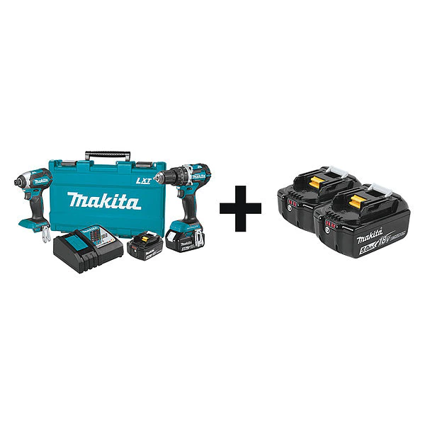 Cordless Combination Kit, Cordless Tools Included Hammer Drill, Impact Driver, Voltage 18V DC, Power Source Cordless, Number of Tools 2, Battery Capacity (2) 4.0 Ah, (2) 5.0 Ah, Tool Brand Makita, Series 18V LXT, Battery Included (2) 33RT43, Mfr. No. BL1840B; (1) 38XU33, Mfr No. BL1850B, Number of Batteries Included 4, Battery Model No. (2) Mfr. No. BL1840B; (2) Mfr No. BL1850B, Battery Series 18V LXT, Charger (1) Mfr. No. DC18RC, Charger Included Yes