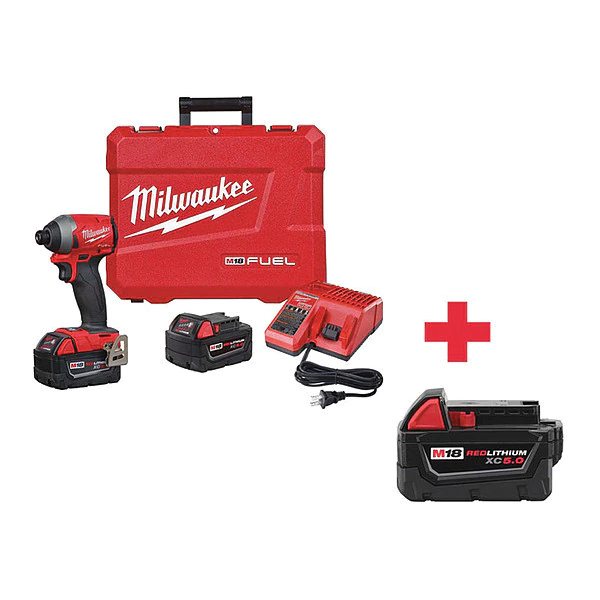 Impact Driver, Drive Size 1/4 in Hex, Drive Configuration Straight, Max. Torque 2,000 in-lb, Voltage 18V DC, Brushless Motor Yes, Free Speed 3,600 RPM, Impact Rated Yes, Impacts per Minute 4300, Number of Speed Settings 4, Collett 1/4 in Hex, Cordless Tool Kit Contents (1) Bare Tool, (3) Batteries, (1) Charger, Number of Batteries Included 3, Battery Capacity (3) 5.0 Ah, Battery Model No. 23Y581, Battery Series M18 Redlithium, Charger Included Yes, Charger Model 23Y581, Case Included Yes