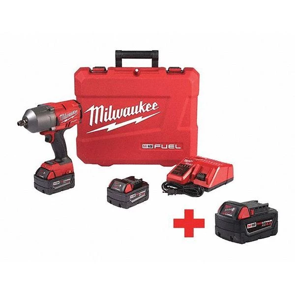 Cordless Impact Wrench Kits, Impact Wrench, Drive Size 1/2 in Square, Drive Configuration Straight, Max. Torque 1,000 ft-lb, Battery Included, Voltage 18V DC, Series M18 FUEL, Cordless Tool Battery Type Li-Ion, Brushless Motor Yes, Anvil Impact Action Mechanical, Max. Blows per Minute 2100, Max. No Load RPM 1700, Cordless, Handle Type Pistol Grip, Battery Capacity (3) 5.0 Ah, Tool Length 8-25/64 In., Tool Weight 5.9 lb, Clutch Style Impact, Battery Included 35GJ99