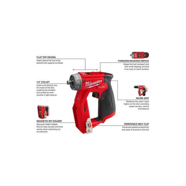 Optimized for the professional who frequently encounters precision fastening applications, the Milwaukee® M12TM 1/4 in. hex screwdriver delivers unmatched precision, power and portability along with a slimmer, more ergonomic grip. A variable speed trigger and 0-500RPM give the user unrivaled fastening control, 15+1 clutch settings prevent over tightening fasteners, and 175 in-lbs. Of torque provides the ability to accomplish tough applications. At 6-1/2 in. long and weighing only 2.0 lbs; its compact, lightweight and durable design provides greater comfort and fits in tighter spaces on the jobsite. The inboard LED light and fuel gauge help you increase productivity and avoid interruptions. Two belt-clip positions for both left- and right-handed users and one-handed bit changes provide maximum ease-of-use. The REDLITHIUMTM battery pack delivers more work per charge and more work over pack life than the competitors.