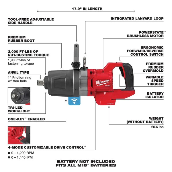 Cordless Impact Wrenches, Impact Wrench, Drive Size 1 in Square, Drive Configuration Square, Max. Torque 2,000 ft-lb, Bare Tool, Voltage 18V DC, Series M18 FUEL(TM), Cordless Tool Battery Type Li-Ion, Brushless Motor Yes, Anvil Impact Action Mechanical, Max. Blows per Minute 1440, Max. No Load RPM 1200, Cordless, Handle Type D-Handle, Tool Weight 21 lb, Clutch Style Impact, Battery Included No, Battery Pack Replacement 481Z42