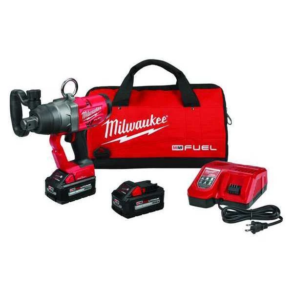 The MILWAUKEE® M18 FUELTM 1" High Torque Impact Wrench w/ ONE-KEYTM is the first cordless 1” High Torque Impact Wrench. The POWERSTATETM Brushless Motor delivers up to 1,800 ft-lbs of Nut-Busting Torque and 1,500 ft-lbs of fastening torque, making this the most powerful cordless impact torque wrench, able to complete the most demanding applications. At only 13 lbs with battery, the tool is up to 7 lbs. lighter than corded units, providing less fatigue for easier overhead job site applications. The battery-powered impact wrench has cordless convenience and eliminates the need for compressors, generators, cords, and hoses, reducing the cost of ownership. A lack of reliance on cord and hoses allow for greater portability and the ability to complete applications unable to be performed with a corded or pneumatic unit. The REDLINK PLUSTM Intelligence achieves maximum performance and protects the high torque impact gun against overloads, over-heating, and over-discharge. M18TM REDLITHIUMTM Battery Packs are compatible with all M18TM tools, delivering more work per charge and more work over the life of the pack. The 4-Mode DRIVE CONTROLTM provides greater control over the output speed and power of the high power impact wrench. The ONE-KEYTM capabilities allows for Customization, Tracking, and Management of the impact wrench. ONE-KEYTM technology also provides the ability to set a repeatable torque output for maximum control.This kit also includes two M18TM HIGH OUTPUTTM XC8.0 batteries, an M18TM & M12TM Rapid Charger, and a contractor bag.