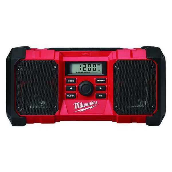 Jobsite Radio, Bare Tool, Voltage 18.0 V, For Use With 120V AC Outlet, Any M18 Li-Ion Battery, Cordless Tool Battery Type Li-Ion, Battery Included No, Battery Pack Replacement Milwaukee M18 Li-Ion Battery, Features 3.5mm Aux In Port, Customizable Equalizer, Digital AM/FM Tuner with 10 Station Presets, Dual Speakers and Passive Radiators, Integrated Handles, Portable Stackable Design, Shock Absorbing End Caps and Metal Speaker Grills, Weather Sealed Auxillary Compartment, Includes Cable