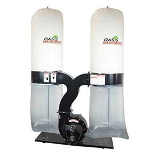 Oasis Machinery Heavy Duty 3HP Wood Dust Collector, DC3000. Oasis Machinery Dust Collector has 3 horsepower with an air speed of 1900CFM. This has the standard 6 inch intake and fits on almost any brand of machine that makes chips, wood dust, or debris. The collector comes with two clear lower bags so you can easily see when to empty them. It also has two large upper bags for premium ventilation.