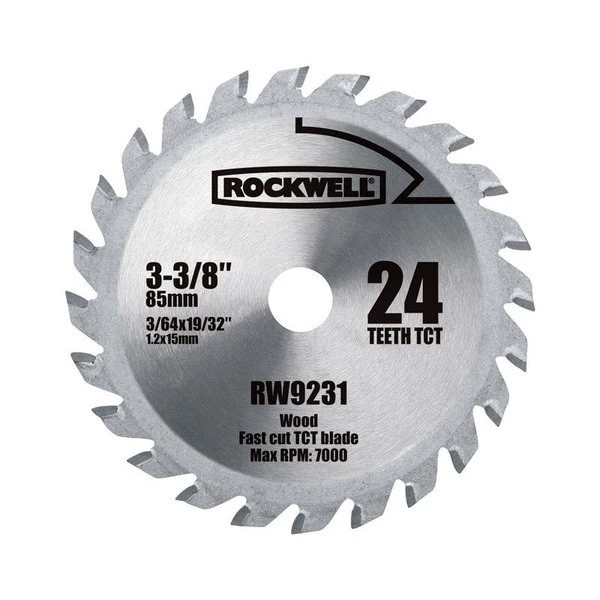 The Rockwell VersaCut 3-3/8 inch carbide tipped blade is 24 tooth and suitable for cutting aluminum and composites.