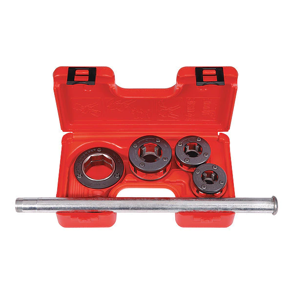 Manual Pipe Threaders, Manual Ratchet Pipe Threader Kit, Functions With Pipes, Pipe Thread Type NPT, Bolt Size No Bolt, For Nominal Pipe Size 1/2 in to 1 1/4 in, Rod Size No Rod, Tubing Size 1/2 in to 1 1/4 in, Manual Pipe Threading Die Heads Included 1/2 in, 3/4 in, 1 in, 1 1/4 in, Ratcheting Yes, Tool Length 25 in, Pipe Equipment Series Super Cut, Manual Ratchet Pipe Threader