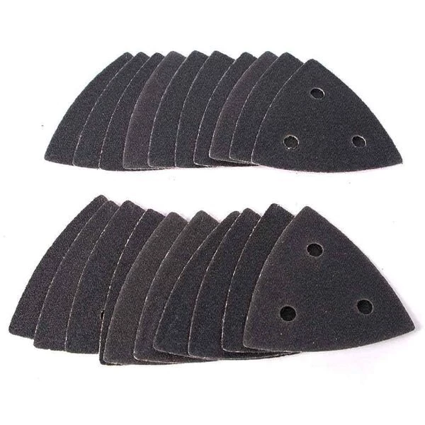 Specialty Diamond MB120 20 pack of 120 grit triangular sanding pads. They are perfect to use in smaller hard to get areas where you need to sand old paint or rust on almost any surface. Ideal for corners and edges. You can use it on wood, fiberglass, and metals. They are 3-3/16 of an inch per side. They fit most triangular backer pads that usually come with your multi tool and fasten via hook and loop. Also known as Hook & Loop.