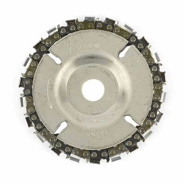 Grinder Disc Chain Saw takes extra muscle work out of cutting, carving, removing and sculpting of wood, plastics, ice and hard rubber with their speed and maneuverability. The chain saw blade is held in place between two steel plates which provides a secure grip for carving. Regardless of grain or knots the blade cuts through the material with ease to the user. Our 22 tooth design provides a smooth “finished” surface which is great for minimal sanding afterwards. Chains can be either be sharpened using a chain saw file or replaced as needed. Great for curved work, like the inside of bowls, for fast waste removal. Maximum running RPM is 14,000 RPM.